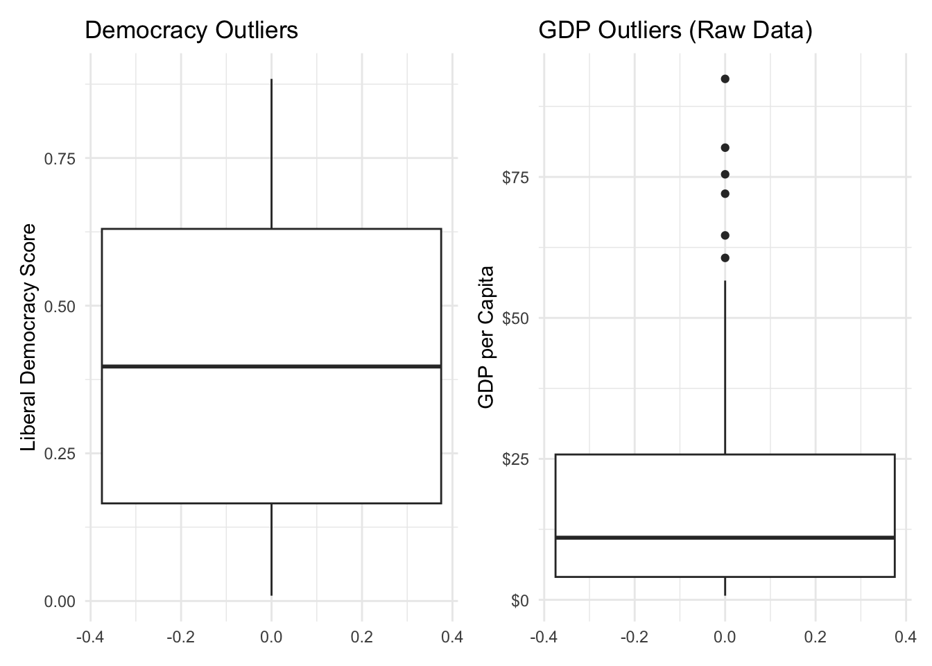 The simplest way to spot outliers is with boxplots. Let’s examine both our variables with boxplots. Here we will create boxplots for both the democracy scores and the raw GDP per capita (before any transformations) using geom_boxplot(), which we learned about in an earlier lesson. We will store each object as a separate object and then use patchwork to combine them into a single figure.