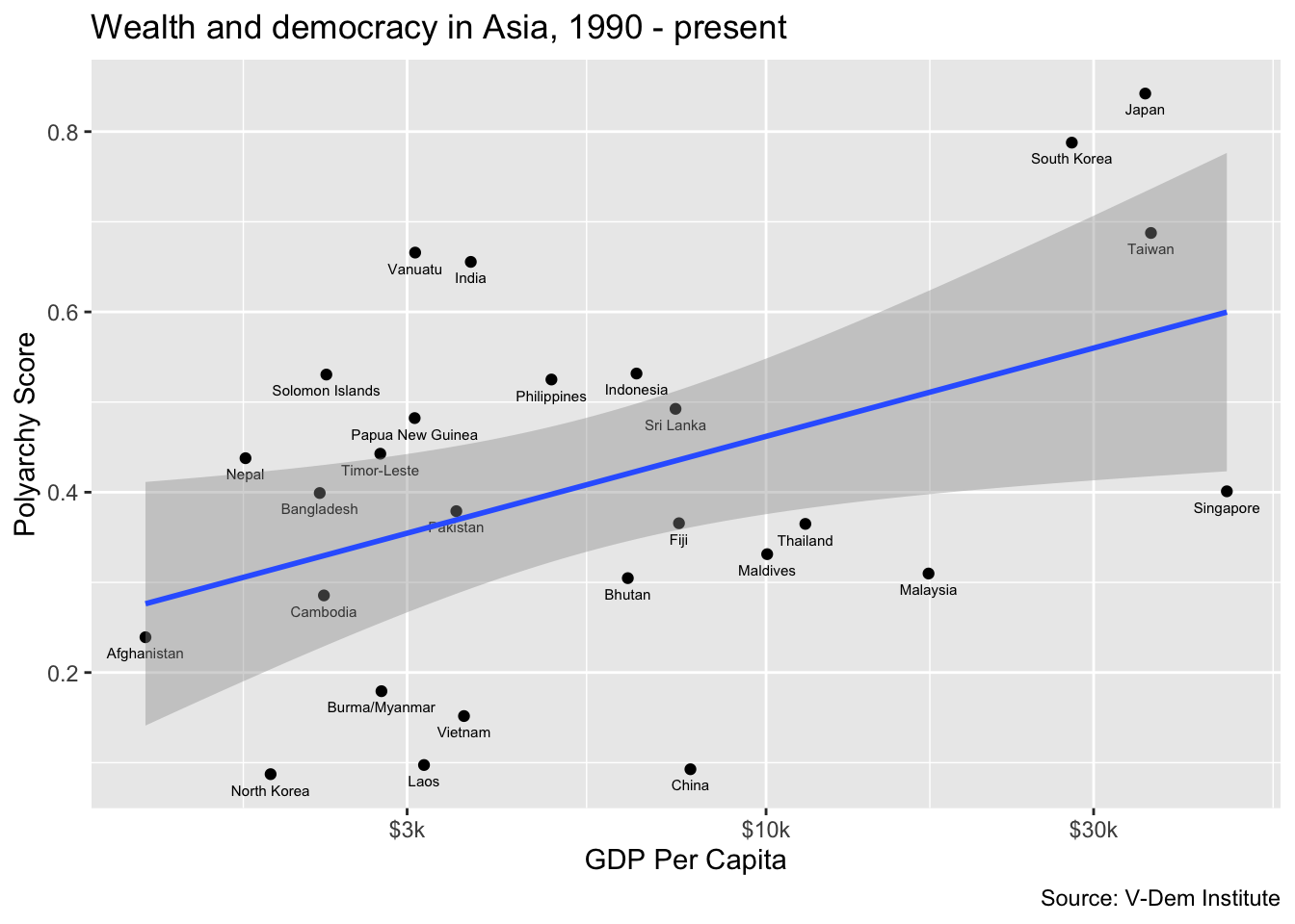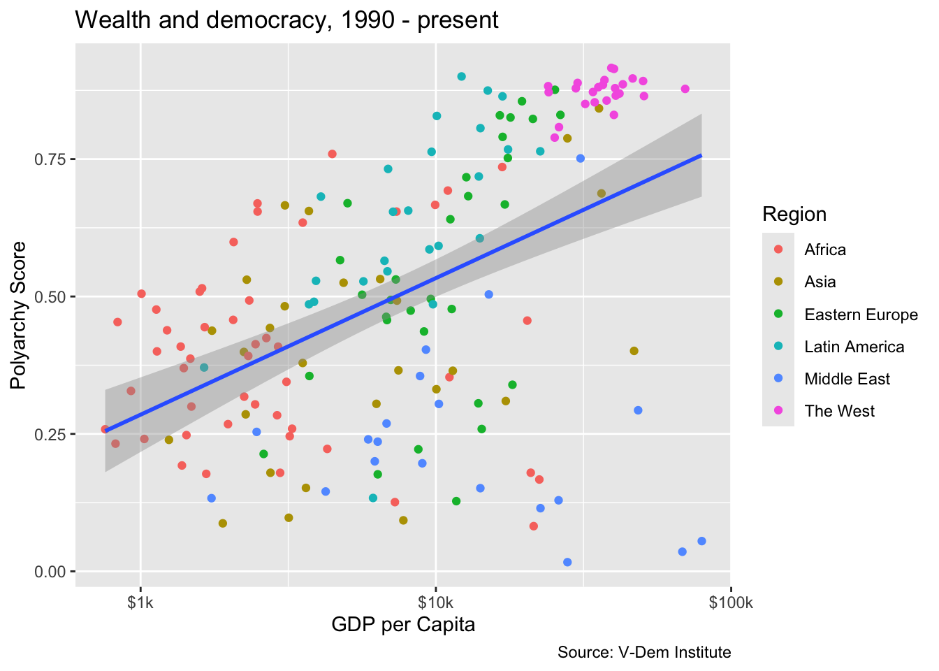 The plot does a good job of illustrating the basic point of modernization theory in that we do see the positive correlation between wealth and democracy. But we also see that there are some outliers and that a lot of the outlier countries are concentrated in the Middle East.