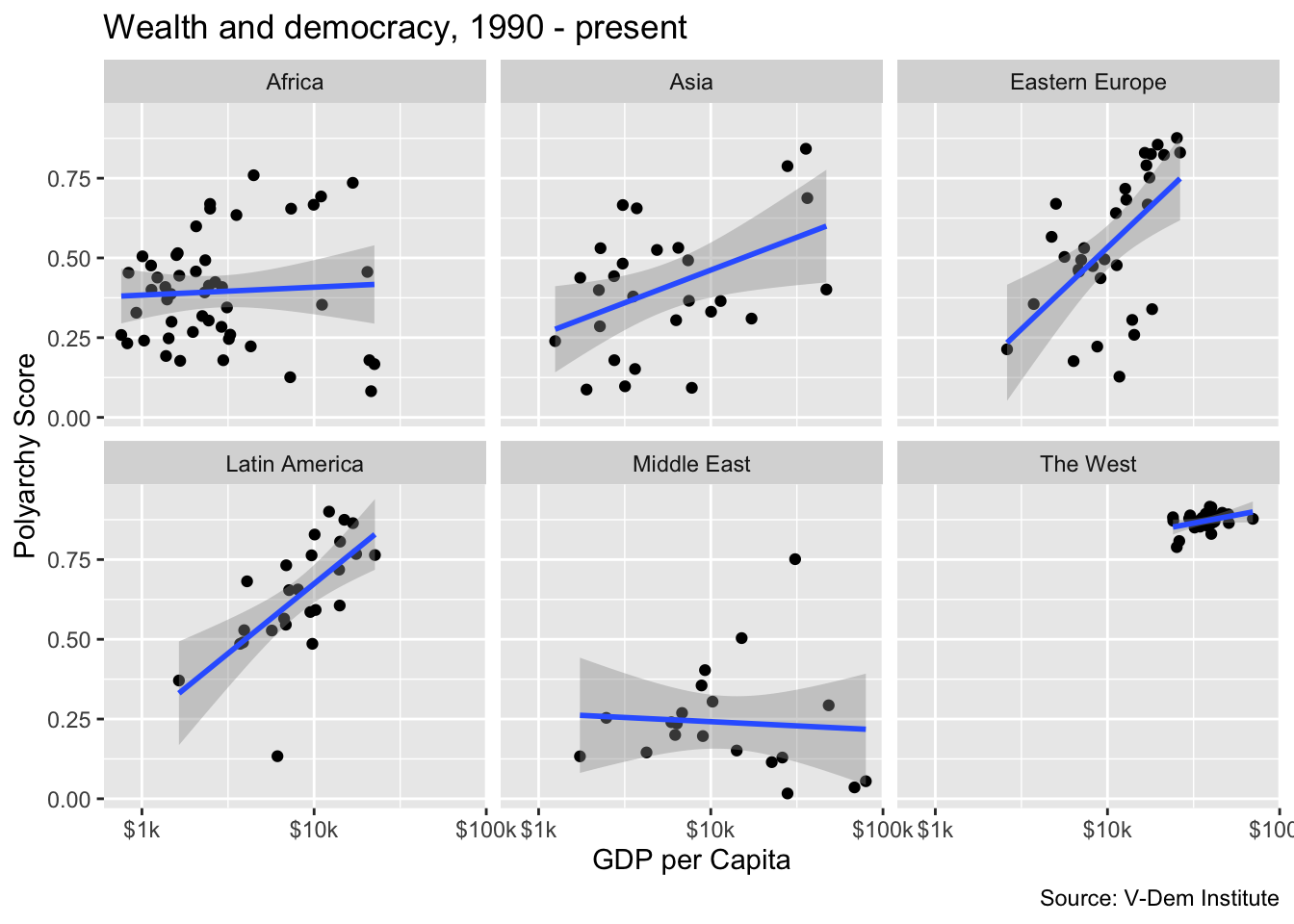 The relationship between wealth and democracy in the West would be apparent, but it is obscured by the fact that western countries because the high wealth and polyarchy values result in extreme bunching in the northwest quadrant of the graph. To deal with this issue, we could add the scales = "free" argument to our plot.