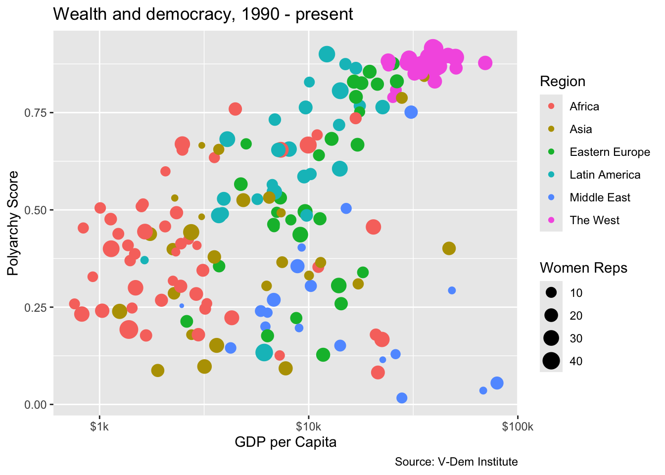 The last thing we are going to do in this lesson is to create a scatter plot. We use scatter plots in order to illustrate how two variables relate to each other (or not). In this example, we are going to illustrating modernization theory, which predicts a positive relationship between wealth and democracy, while also incorporating levels of women’s representation into our analysis.