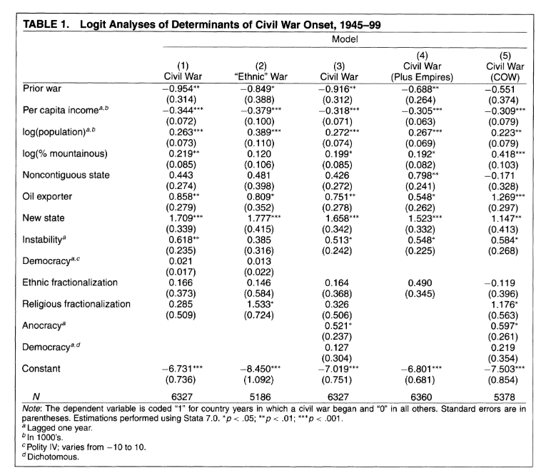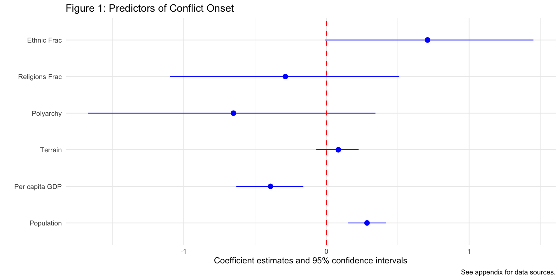 reference = "See appendix for data sources." # store reference notes| Ethnicity | Democracy | Terrain | Full Model | |