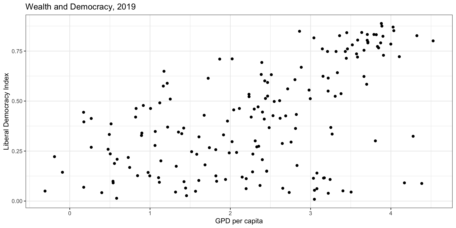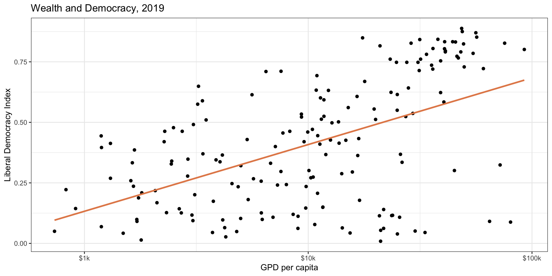 ggplot(modelData, aes(x = wealth, y = lib_dem)) +geom_point() +geom_smooth(method ="lm", color ="#E48957", se =FALSE) +scale_x_log10(label = scales::label_dollar(suffix ="k")) +labs(title ="Wealth and Democracy, 2019",x ="GPD per capita", y ="Liberal Democracy Index") +theme_bw()