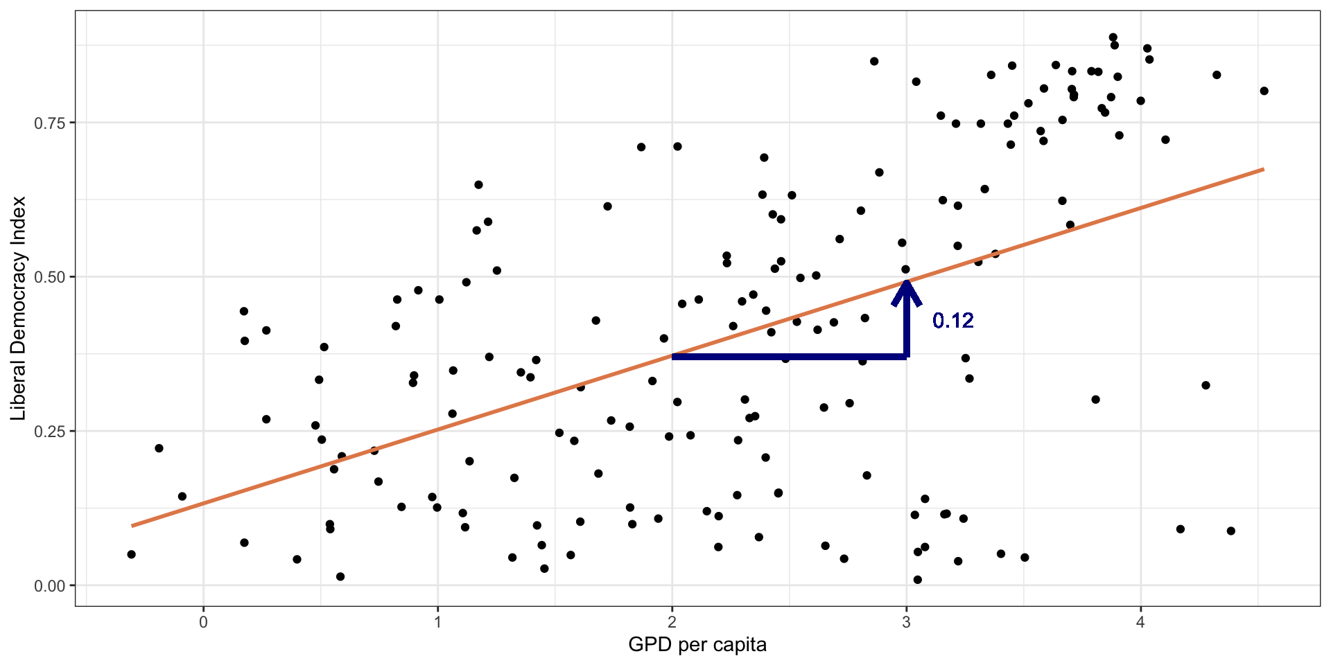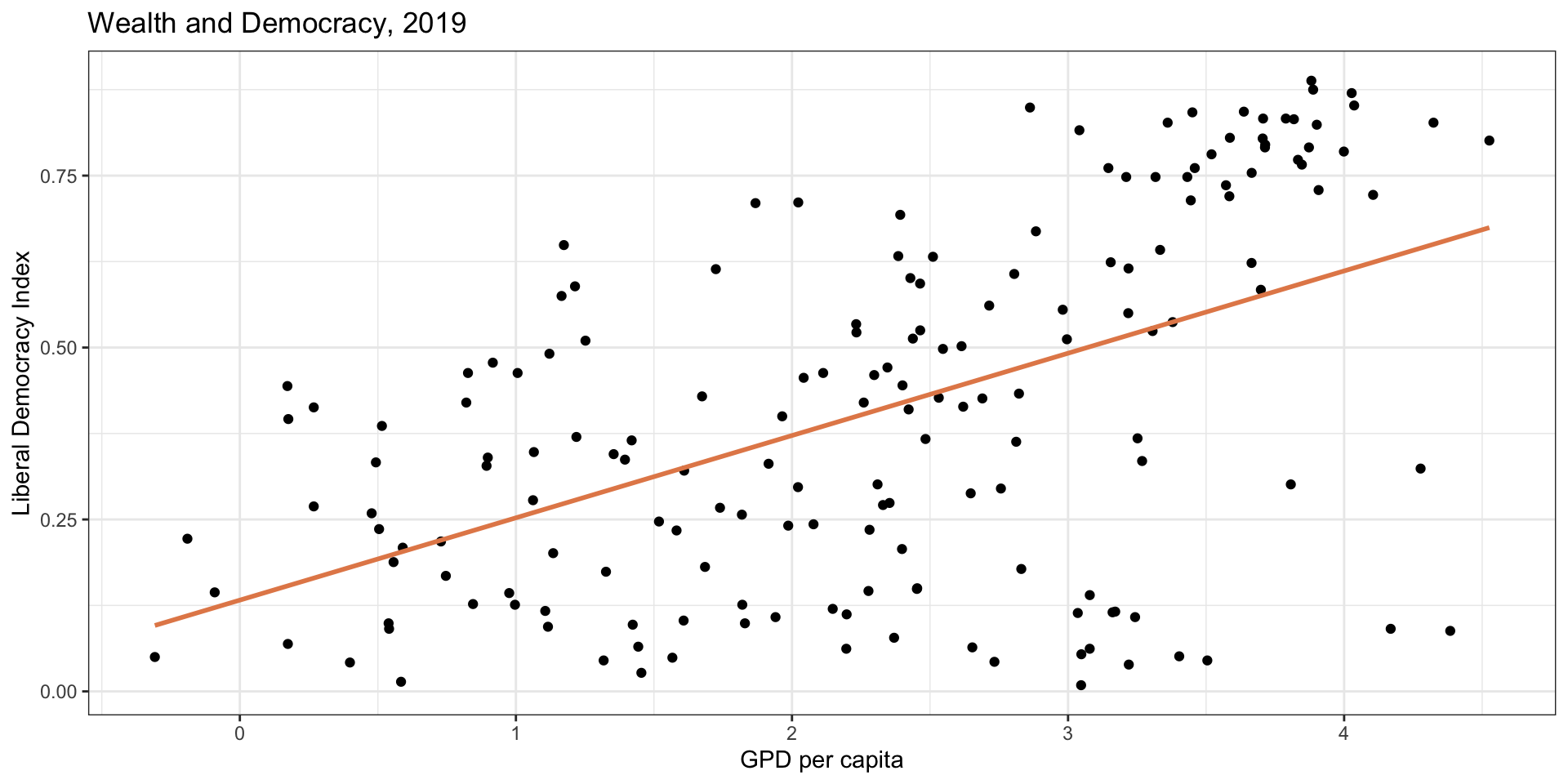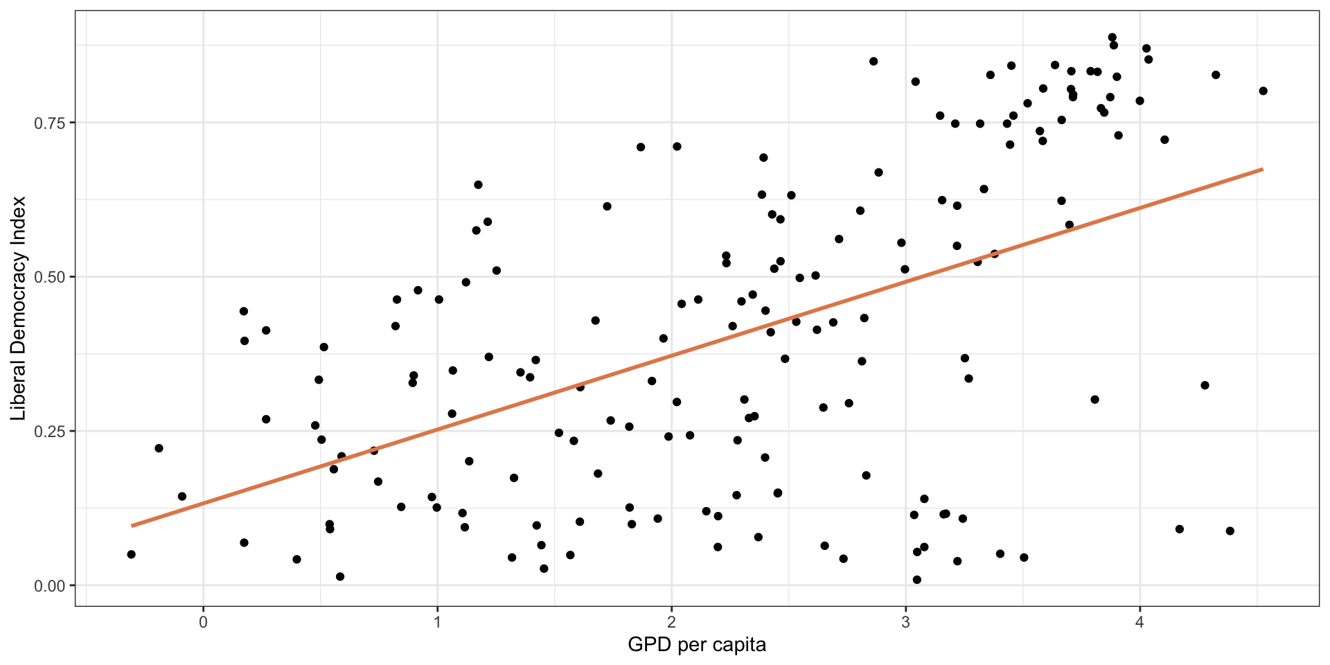 ggplot(modelData, aes(x = wealth, y = lib_dem)) +geom_point() +geom_smooth(method ="lm", color ="#E48957", se =FALSE) +labs(x ="GPD per capita", y ="Liberal Democracy Index") +theme_bw()